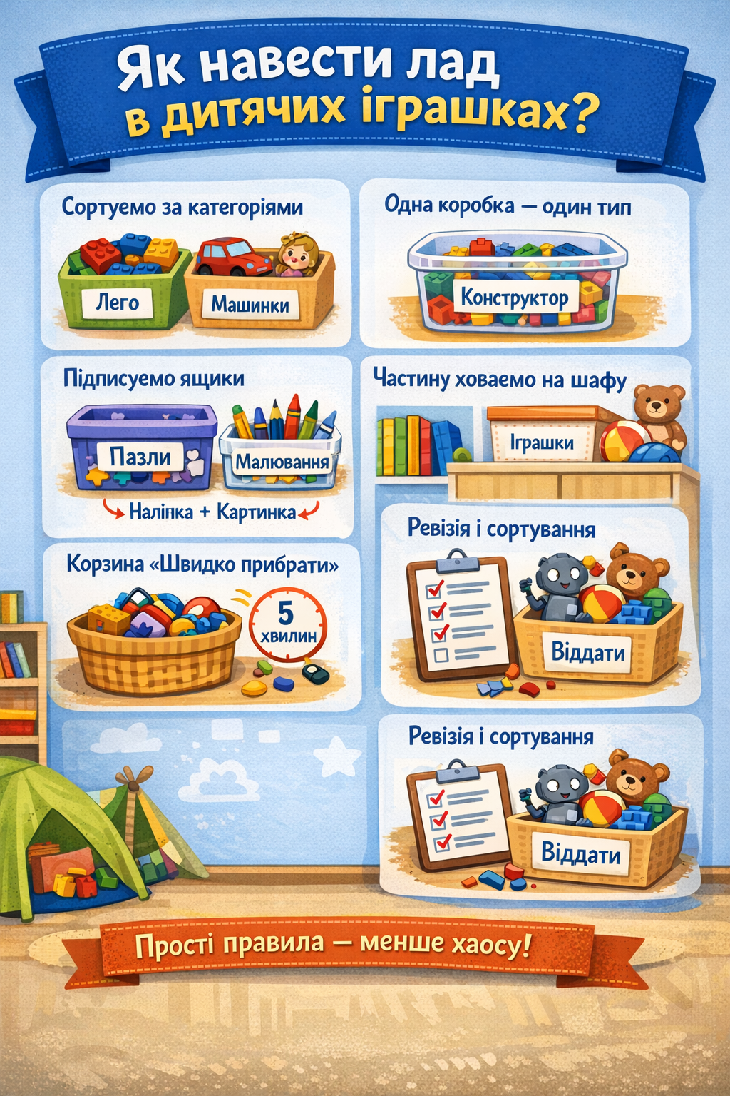 Хаос с детскими игрушками - это не "нормальность", с которой нужно смириться, а проблема, которую легко уменьшить простыми правилами. Лучше всего работает не идеальный порядок, а система, которую реально поддерживать каждый день. Ниже – проверенные советы, которые помогут быстро навести порядок и не тратить на уборку весь вечер.